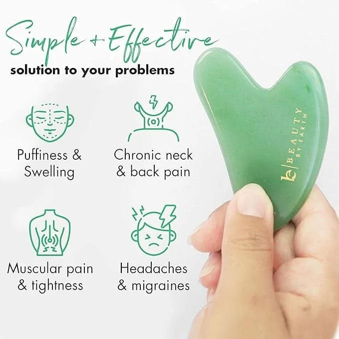 A promotional image showing a jade roller by Beauty Beasts, which is marketed as a simple, effective solution for common issues like puffiness, swelling, chronic neck and back pain, muscular pain, tension, headaches, and migraines.